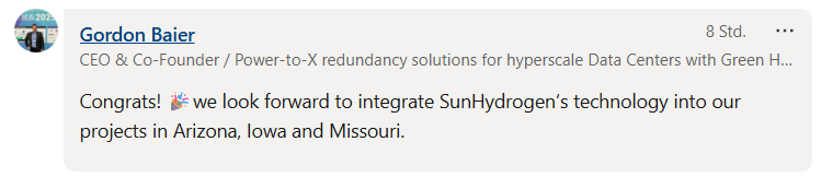 Congrats! we look forward to integrate SunHydrogen‘s technology into our projects in Arizona, Iowa and Missouri.