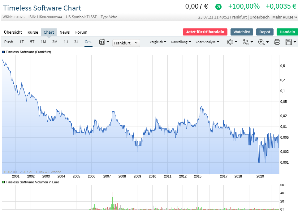Bin schon sehr lange in Timless Software investiert (seit dem Jahr 2000). Als ich sie gekauft hatte, ging es steil nach unten. Aber mich würden jetzt mal News zu dem Unternehmen interessieren, wenn es denn welche gibt, denn finden tu ich nirgends etwas... Verkaufen werde ich die Aktie keinesfalls, denn mehr verlieren kann man fast nichmehr. 2000Stk hab ich damals gekauft zum Kurs von 0,61€... Also falls jemand etwas über das Unternehmen weiß, über die Entwicklung, Nachrichten oder auch sonst etwas bitte bei mir melden :) Wäre nett!