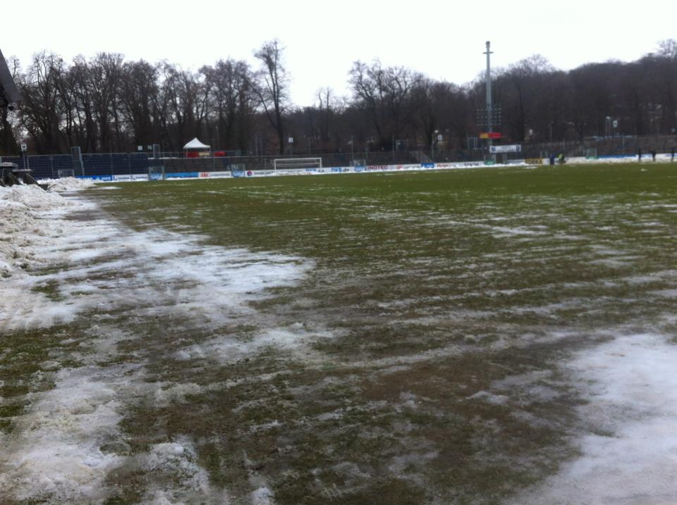 Der Platz is von Schnee befreit, aber der Schnee muss noch von den Seiten irgendwo hin abtransportiert werden. Bei uns mitten im Ort und im engen Stadion nich so einfach wie man denkt. Wird man wohl heute noch ne Schubkarrenaktion machen müssen.