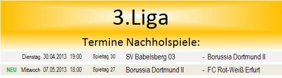 da waren es nur noch 2 Nachholspiele... Allerdings gehts nun bis in den Mai hinein.. denn katjuscha hat es heute schon einmal angebracht - das für den 24.04. angesetzte Spiel Dortmund II - Erfurt wurde auf den 07.05. verlegt!!