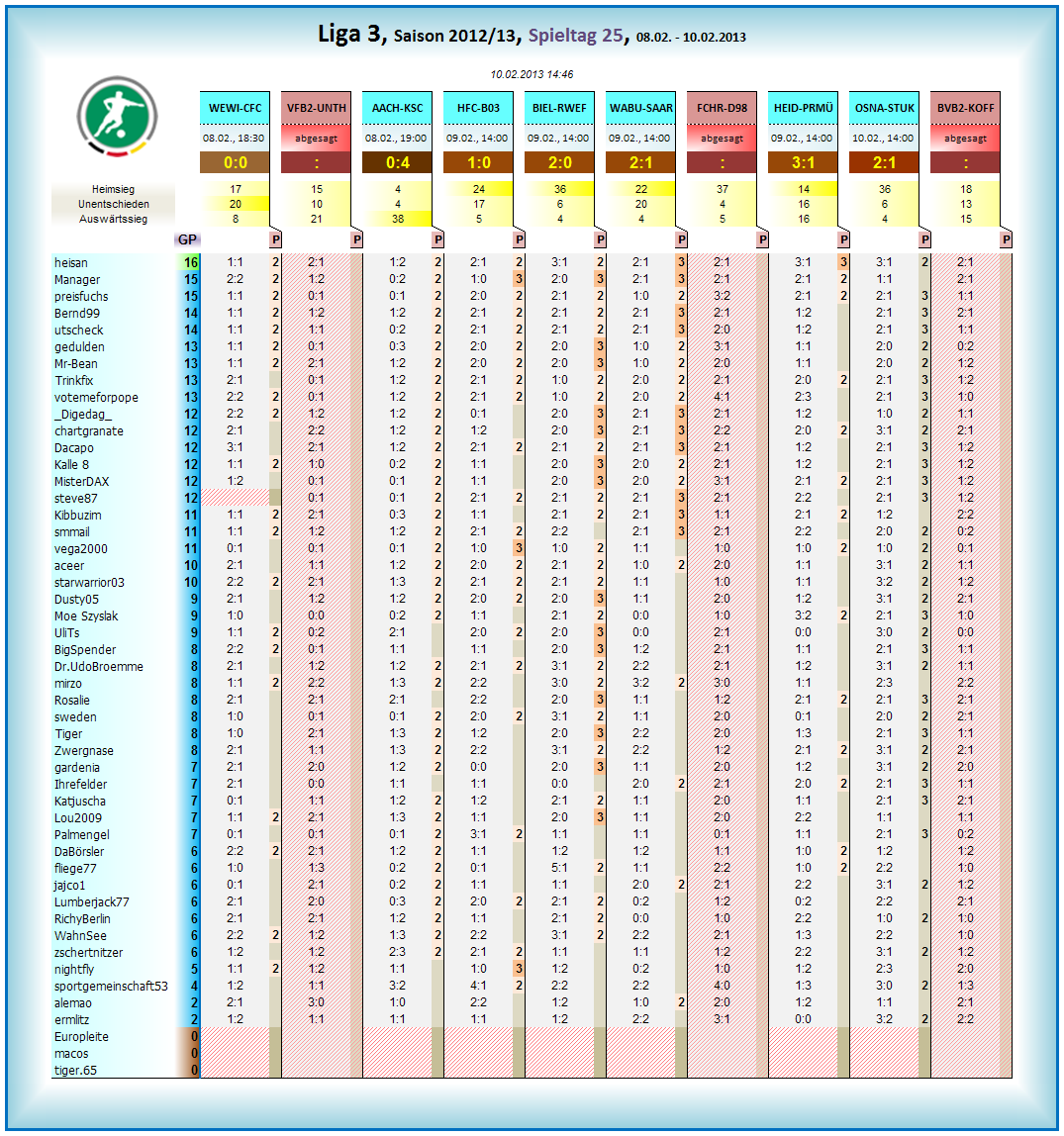 vorläufige Auswertung gibts gleich im Liga3 Tippthread, und Eröffnung des 26.Spieltages ebenso...