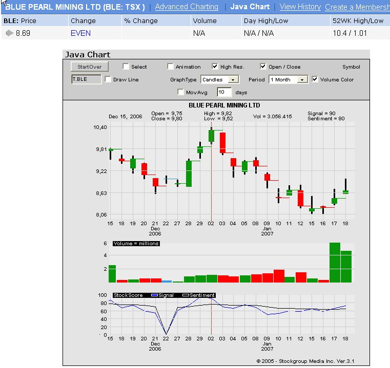 Shares in Blue Pearl traded at $8.67, up 43 cents or five per cent in the early afternoon after going as high as $8.73 with more than 5.4 million shares changing hands.