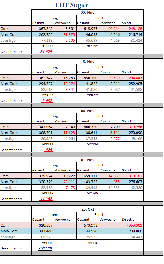 Ich habe mir mal COT Report selber erstellt, nur um zu sehen, was hinter den Kulissen passiert. Wie man sieht, bauen Commerzials die Short Positionen ab. Bei Zucker hat das eigentlich nicht so viel zu sagen, den als Zuckerpreis stieg, wurden die Short Positionen erhöht....