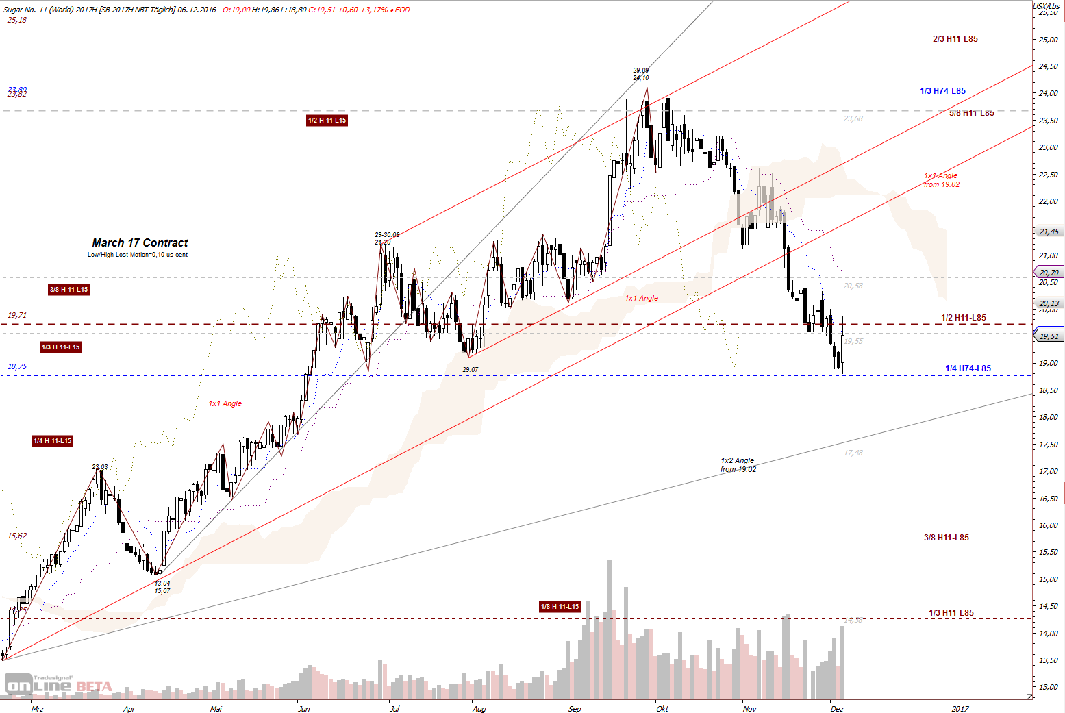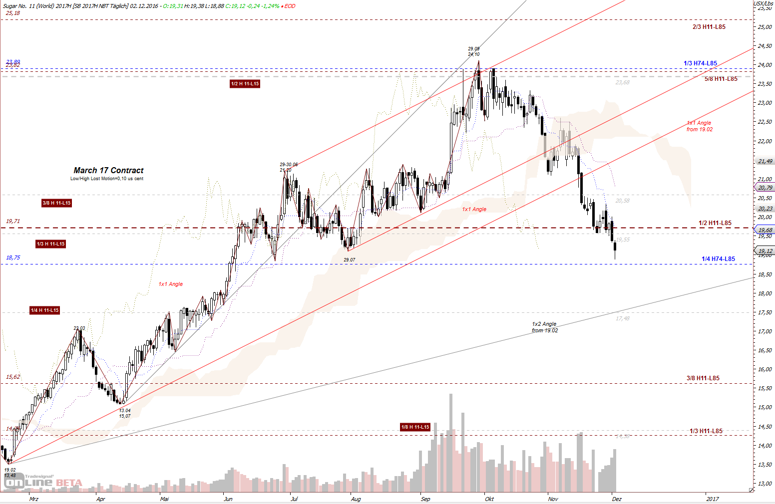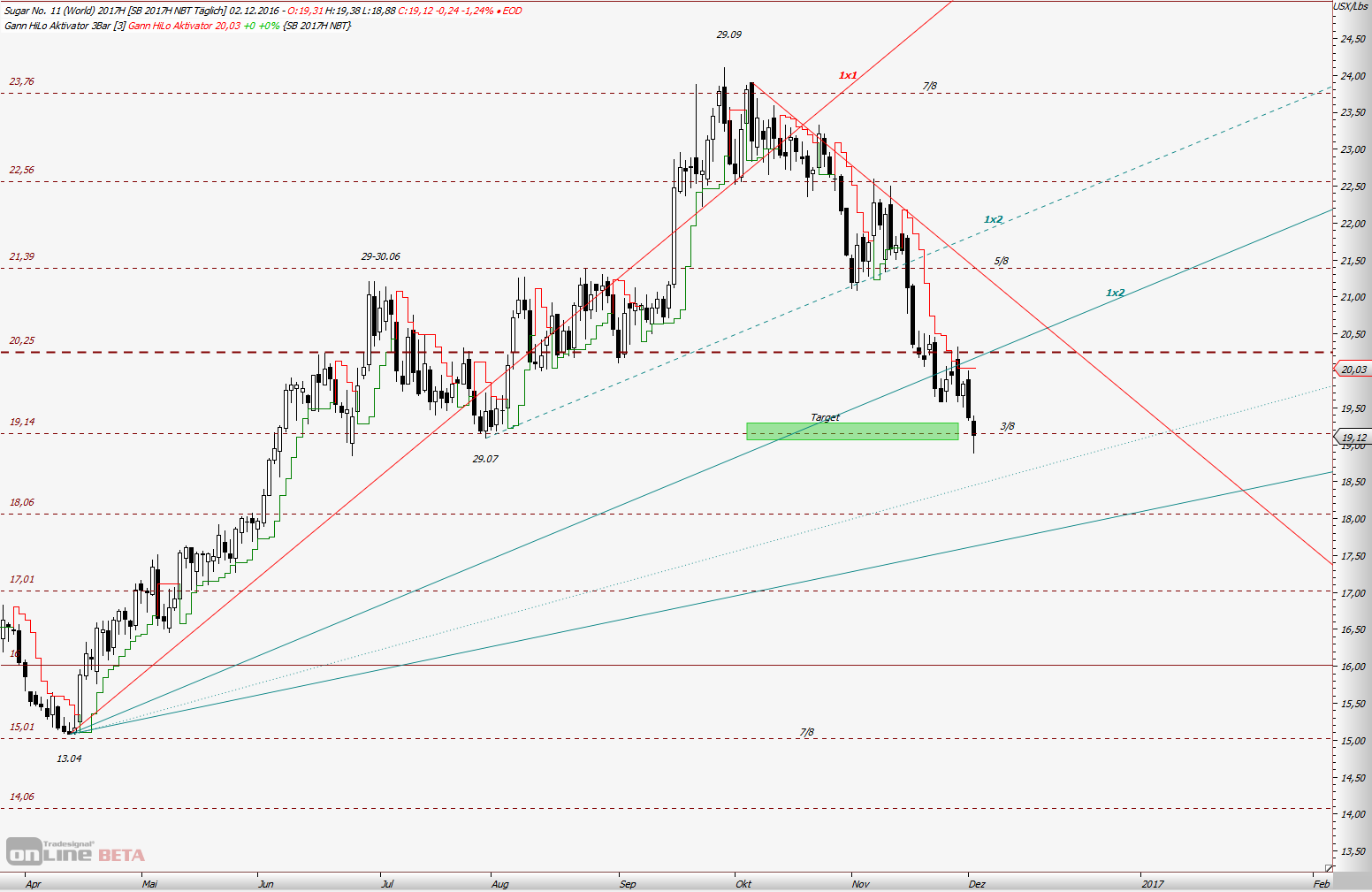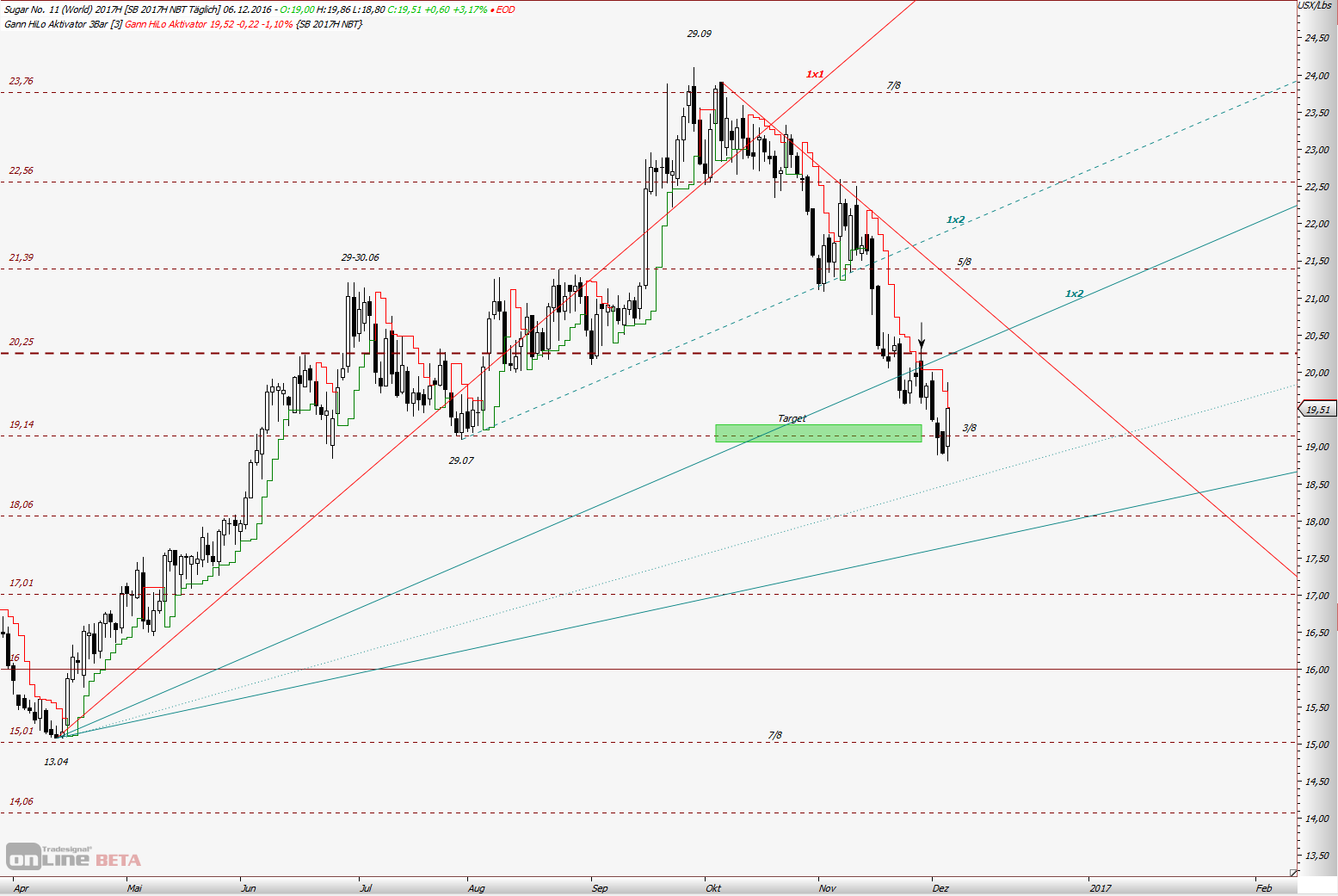 Aus diesen Zahlen liegt 1/2 Gann Linie bei 34,17 US Cent. Im Feb 2011 machte Zuckerpreis ein Hoch bei 36,08 und fiel wieder.