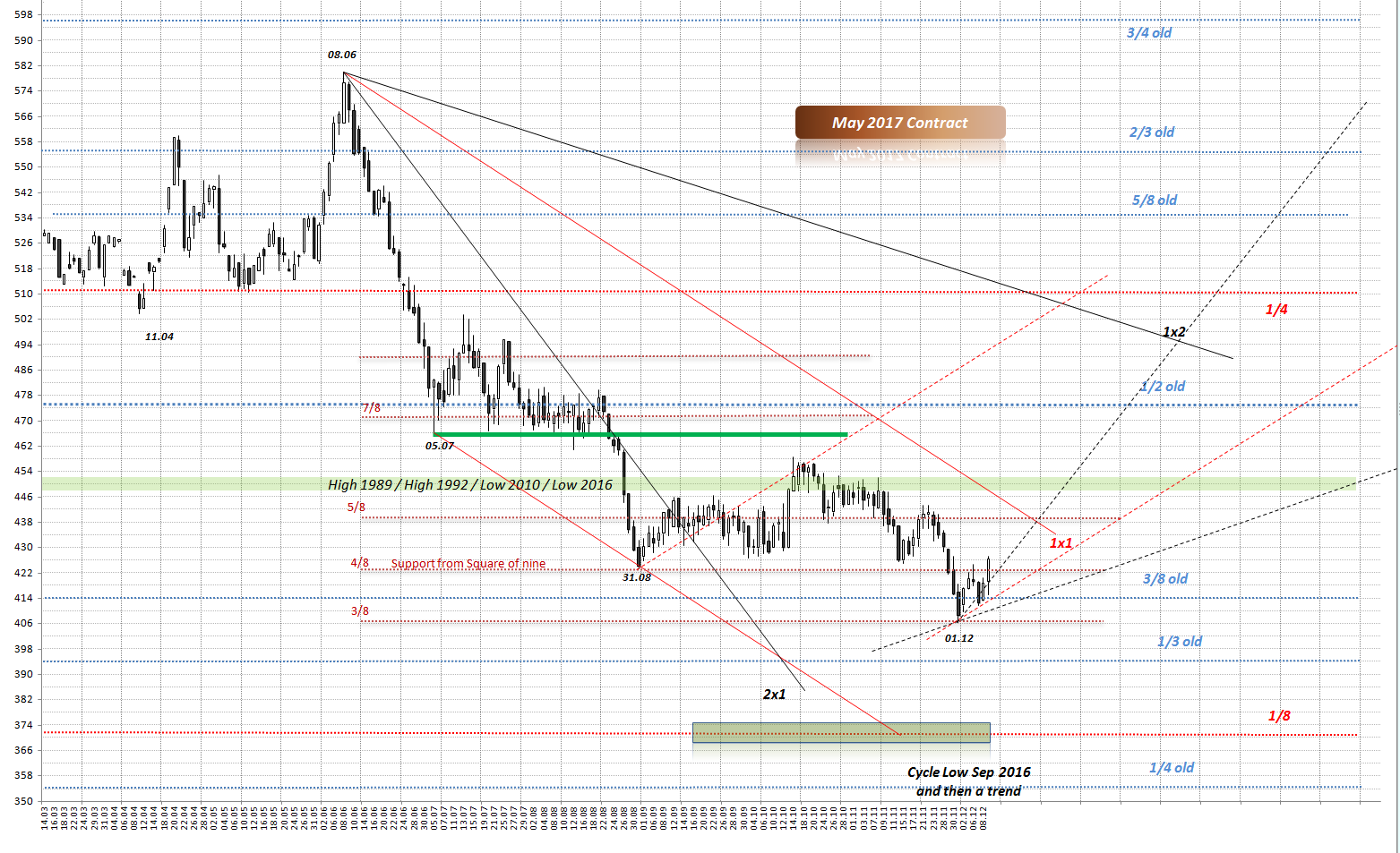 Hier mein Chart nach Gann. Warum im September die Korrektur begann ist wohl klar. Starker Widerstand, Cluster von mehreren Gann Linien und gleichzeitig Ausgleich von Preis und Zeit an der Gann Winkellinie (High am 29.06 + 90° Square of nine = 29.09)