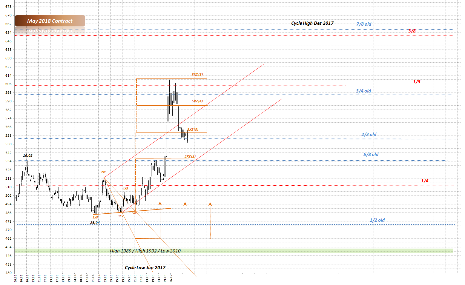 Aufwärtsbewegung dauerte bei Weizen 10 Wochen und korrigiert erst 2 Wochen - fazit: Weizen ist im Aufwärtstrend.