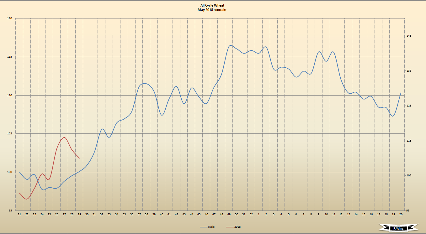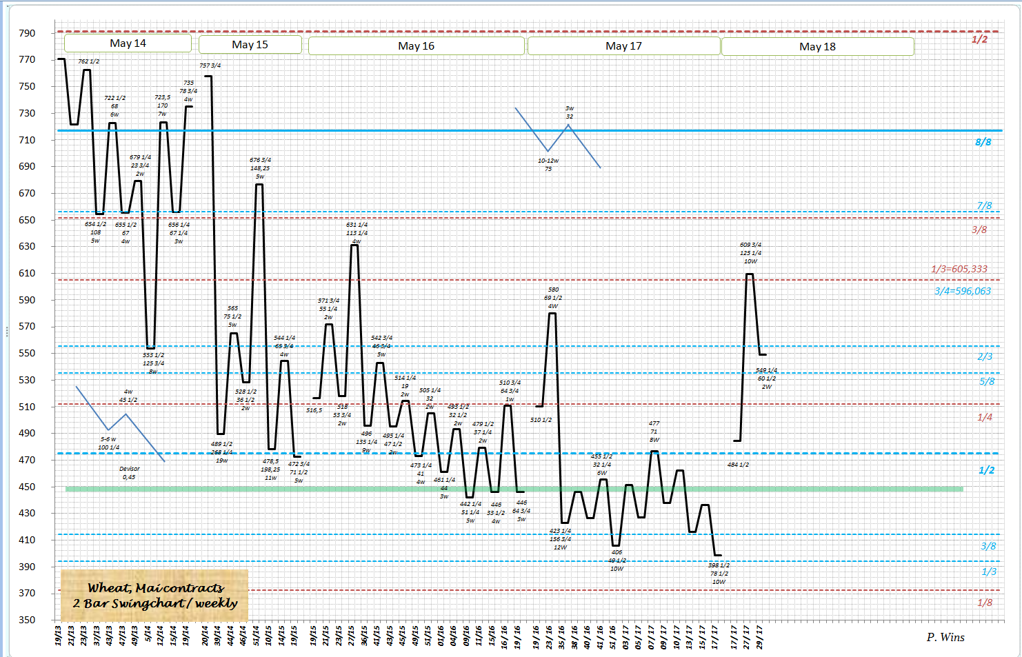 Im Swingchart, wenn Weizen volatil gehandelt wird, habe ich mal durchschnittliche Preisentwicklung errechnet. Im Durchschnitt geht Weizen ca. 10 bis 12 Wochen in Trendrichtung, danach folgt Korrektur von ca. 2 bis 3 Wochen und Trend wird darauf hin wieder aufgenomen.