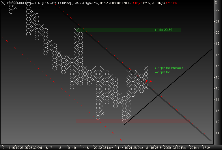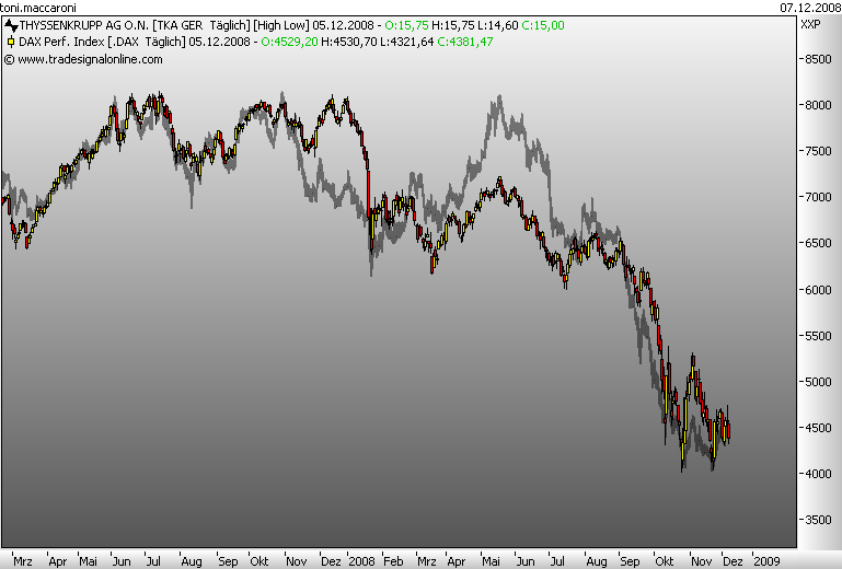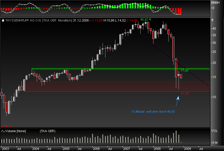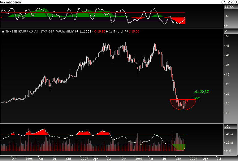 Also diese Woche hatte sich die TK Aktie von ihrer positiven Seite gezeigt. Am Montag sehen wir feste Kurse über den 16 € bis an die 17 € reichend. Wir erhalten starken Rückenwind vom DJ, der sich auch am Freitag stark präsentierte. Der DAX könnte schon am Montag die 4800 Punkte Marke überschreiten und sie über einen längeren Zeitraum halten. Wieder hat sich einmal bestätigt, dass TK eine sichere Anlage geblieben ist und sich schon im nächsten Jahr, also ab September 2009, wieder stärker präsentieren wird. Wir müssen uns die anstehenden Bundestagswahlen vor Augen halten. Unabhängig davon wer die Macht in Deutschland übernehmen wird, muss die wirtschaftliche Kraft Deutschlands vorantreiben und wenn es nur über einen "künstlich hervorgerufenen" Boom am Amfang zu meistern sein wird. Lehnt euch zurück und genießt die Tatsache einer der besten Aktie - auf lange Zeit gesehen - zu bestzen. Ein schönes Wochenende wünsche ich euch.