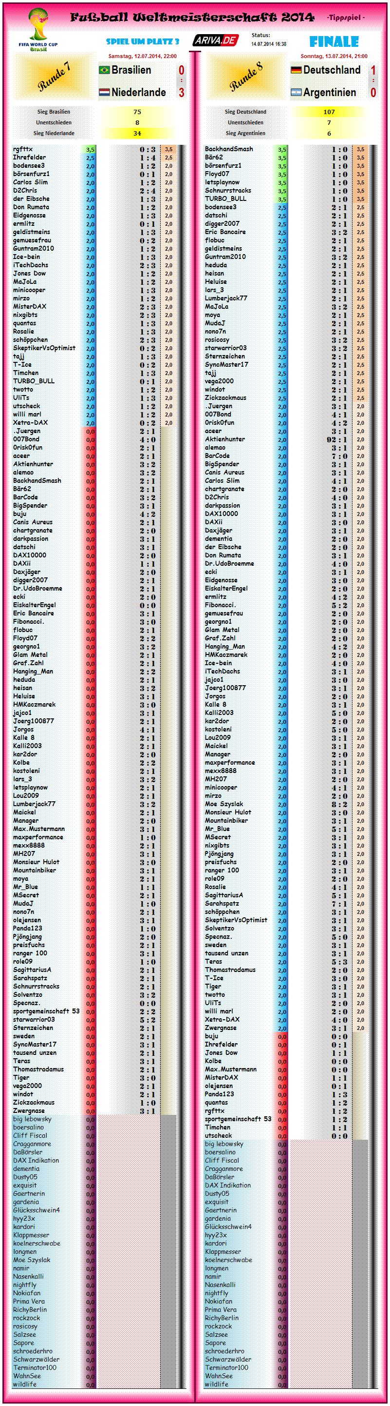 Gespielt wird Tipprunde 7, das Spiel um Platz 3 der WM2014 am Samstag, den 12.07.2014, ab 22:00 Uhr... und Tipprunde 8, das Finale der WM 2014 am Sonntag, den 13.07.2014, ab 22:00!!