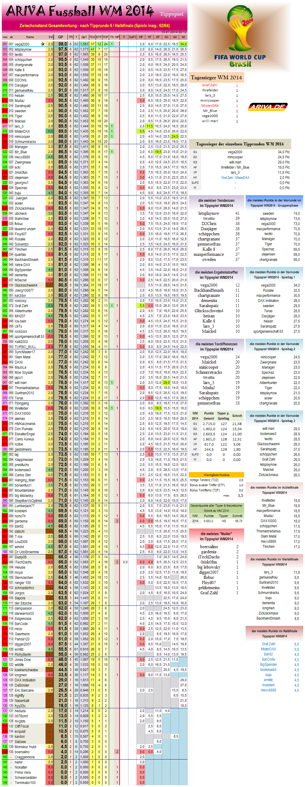 hier gehts noch einmal rückblickend zur Tageswertung Halbfinale (Tipprunde 6) >>> www.ariva.de/forum/Tippspiel-WM2014-Halbfinale-503760?page=6#jumppos154