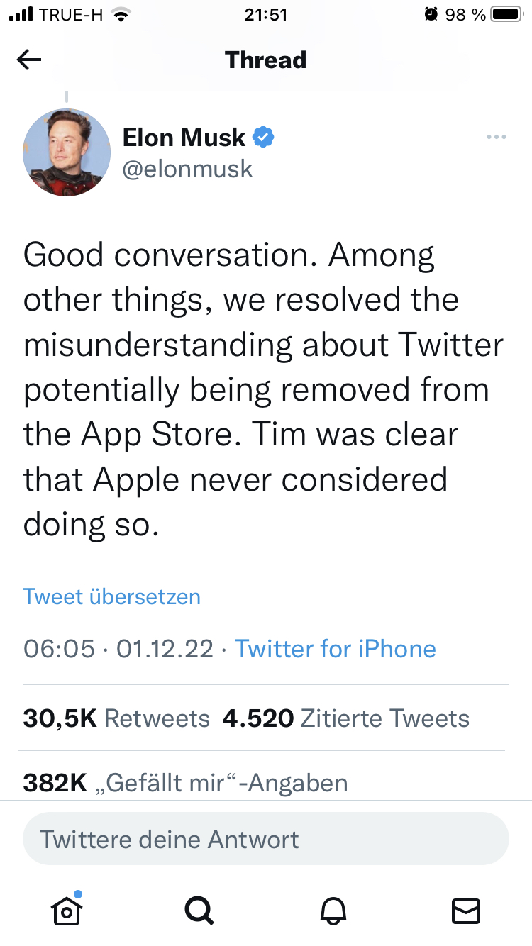 Er hat einfach einen wieder einmal rausgehauen und gelogen. Dabei hatte er nur Panik, dass Apple die Werbung komplett streicht. Um nichts anderes ging es. Nicht Feedom of Speech oder ähnlichen Quatsch. Er ist einach ein hypocritical, transparenz oder näheres zum Gespräch mit Tim Cook wollte er nun auch nicht beitragen. F'U Elon