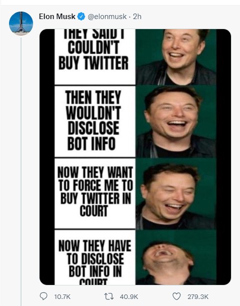 Musk hat sich Ende April zum Kauf Twitters verpflichtet, ohne die im Vorfeld üblichen Prüfungen der Firma ("due diligence") durchzuführen. Musk soll 54,20 US-Dollar je Twitter-Aktie zahlen, was Gesamtkosten von zirka 46,5 Milliarden US-Dollar entspricht. Doch nach Abschluss des Vertrags hat der Multimilliardär die Lust an dem Kauf verloren. Zunächst versuchte Musk, den Kaufpreis für Twitter zur drücken. Insbesondere beschuldigte er Twitter, inkorrekte Statistiken über unechte Profile und Spam zu verbreiten.