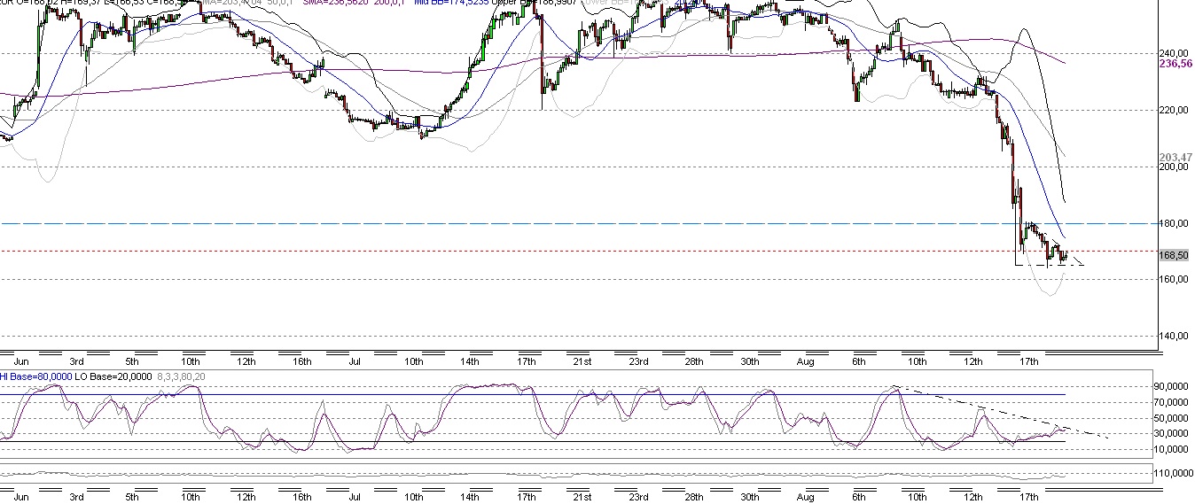 Gegenwärtig findet der Abwärtstrend einen signifikanten Unterstützungskorridor im Kursbereich 168 EUR - 170 EUR. Es kann wohl davon ausgegangen werden, dass sich der Kursabschwung weiter fortsetzen wird. Kursfluktuationen nicht ausgeschlossen, aber der Gesamttrend wird wohl abwärts gerichtet bleiben.