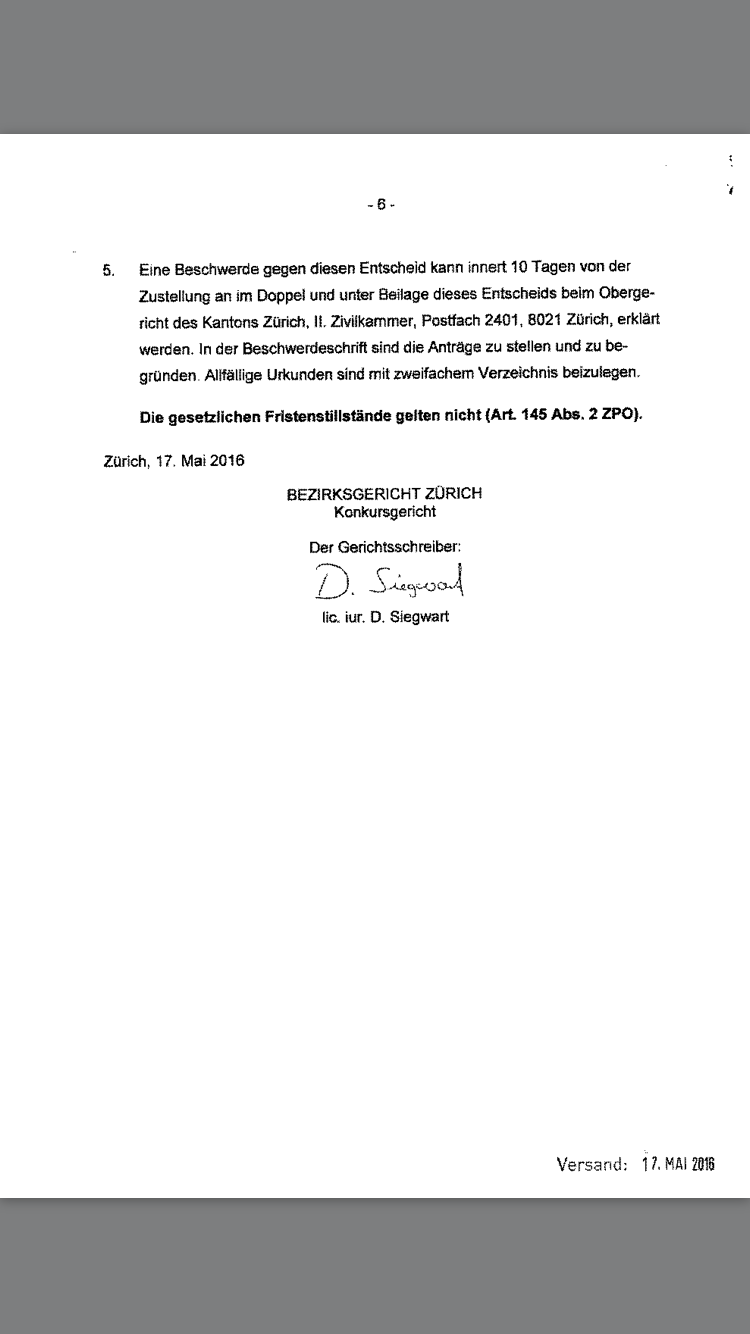 "Mit Urteil vom 17.05.2016 hat der Konkursrichter des Bezirksgerichts Zürich über die
