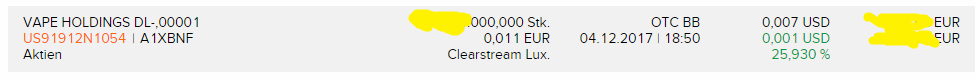 Ich befinde mich gerade bei der Entrümpelung meines Depots und bin auf einige Stück VAPE gestoßen die ja in DE schon seit langer Zeit nicht mehr handelbar ist. Gibt's noch jemanden in der gleichen Situation bzw. falls ja, habt/hatte ihr Möglichkeiten für einen Handel an der OTC BB (da wird ja in geringem Umfang noch getradet)?
