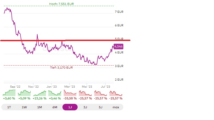 Wer zum Börsenstart Volvo Cars zu roundabout 6 € gekauft hat, schaut natürlich auf einen deftigen Kursverlust. Na ja, seinerzeit spielte bei der Neuemission eine Menge Euphorie beim Kursauftakt eine Rolle (Anfand November 2021). Chinesische Werte waren damals einfach en vogue. Und alles lief ja auch erst einmal super gut. Fst 9 € waren Anfand 2022 angesagt. Doch dann ging es dramatisch abwärts. Eigentlich hätte man jeden mit "dem Klammersack pudern" müssen, der ab Mitte 2022 Volvo Cars weiterhin im Depit hielt. Bis fast 50 % ging es seit Emissionsbeginn abwärts. Doch bei 3,20 € drehte es langsam. Und endlich kam i Juli 2023 die lang ersehnte Kaufempfehlung. Seitedem geht's bergauf. Jetzt muss erst einmal die 5 € Grenze überwunden werden. Dann stehen die Aufstiegschancen in Richtung 7 € wieder gut, und das sind seit Anfang Juni immerhin über 100 %.