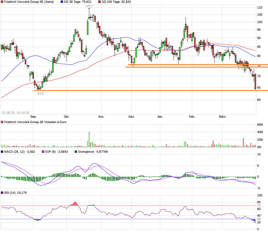 Die Vorwerk-Aktie befindet sich seit Anfang 2024 in einem langfristigen Aufwärtstrend, gegenüber dem damaligen Kurs verachtfachte sich der Kurs. Am Dienstag verliert sie aktuell -1,5% und steht bei knapp 80 €. Gewinnt sie 2026 wieder an Fahrt?