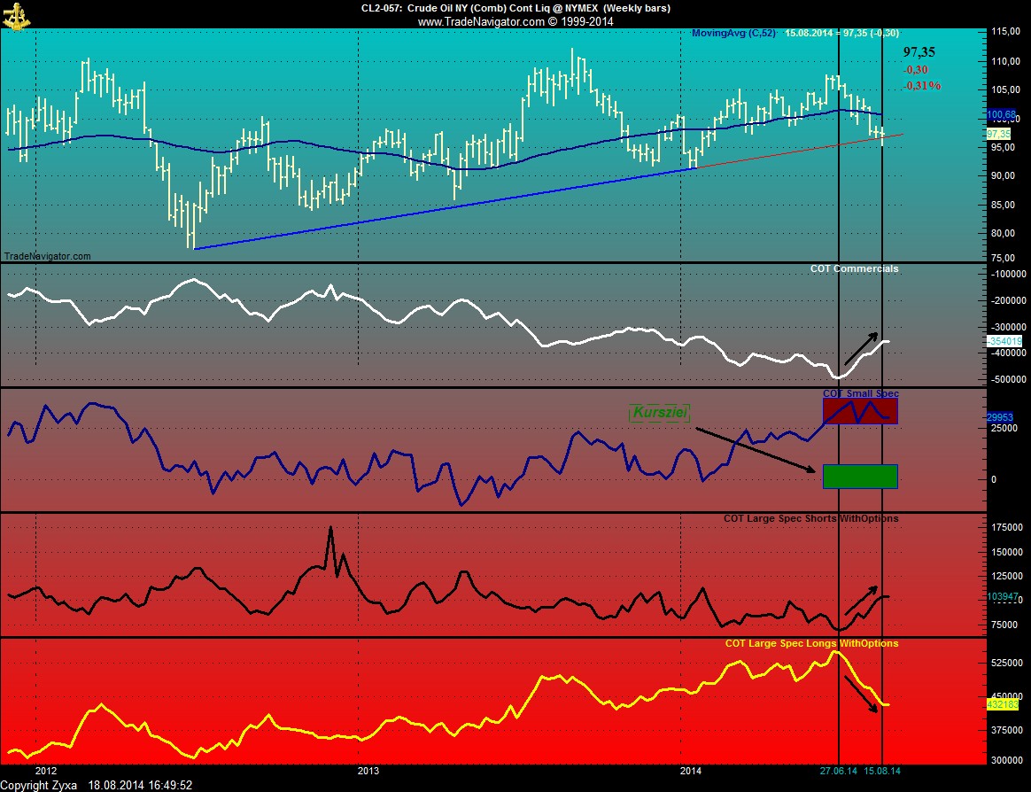 Ich habe die small Specs bei deren OI-Tiefs markiert und immer da war auch ein Preis Tief, gleichzeitig sieht man bei einem starken OI der Commercials anschließend eine Preiserholung.