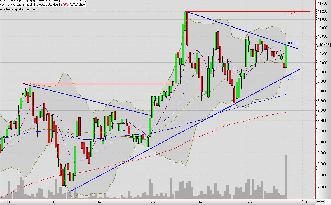 Rückblick:­ Die Wacker Neuson Aktie pendelte innerhalb der mittelfris­tigen Aufwärtsbe­wegung von September bis April seitwärts zwischen 7,85 und 9,50 Euro, bevor Mitte April wieder größerer Kaufdruck aufkam. Die Aktie schoss dynamisch aus der Seitwärtsr­ange hinaus und kletterte bis ans Kursziel bei 11,01 - 11,30 Euro.