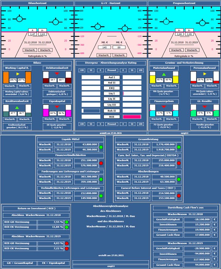 Positiv: Gesamtleistungswachstum von ca. +8%, Restrukturierungsmaßnahmen scheinen im Bereich der Materialaufwandsquote und somit bei der Kennzahl Rohertrag II-Quote zu greifen. Kennzahl Working Capital Ratio mit 287% sehr stabil.