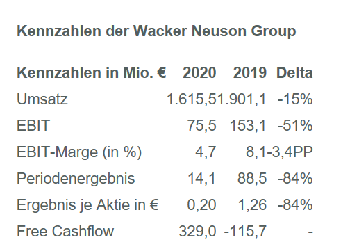 21.1.21: "Der Umsatz der börsenotierten Wacker-Neuson-Gruppe, deren eine Hälfte in Oberösterreich beheimatet ist, ist im Vorjahr von 1,9 auf 1,61 Milliarden Euro zurückgegangen, das Ergebnis vor Zinsen und Steuern (Ebit) hat sich von 153 auf circa 73 Millionen Euro halbiert."