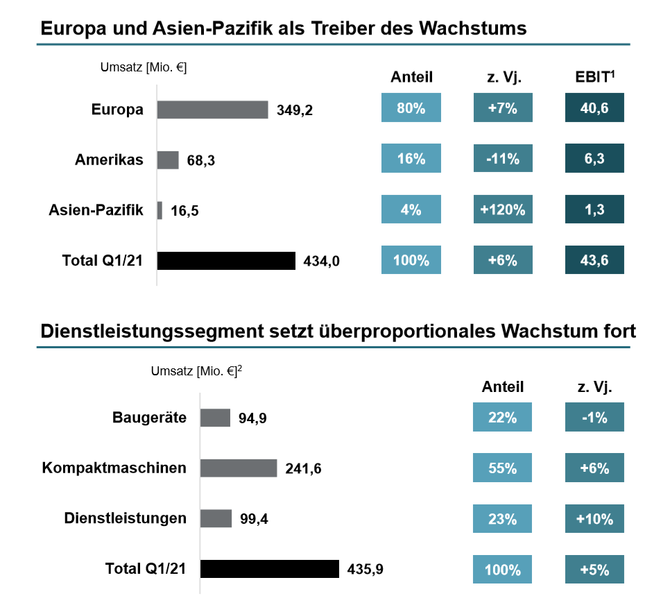 München, 19. April 2021 - Die Wacker Neuson Group erwartet nach vorläufigen und ungeprüften Zahlen für das erste Quartal 2021 einen Konzernumsatz von 434,0 Mio. Euro (Q1/20: 410,8 Mio. Euro). Dieser liegt leicht über dem Konsensus der Analystenschätzungen, der von einem externen Dienstleister für das Unternehmen erhoben wurde (Konsensus: 418,1 Mio. Euro). Das Ergebnis vor Zinsen und Steuern (EBIT) liegt auf vorläufiger Basis bei 43,6 Mio. Euro (Q1/20: 28,9 Mio. Euro) und damit deutlich über dem Konsensus (Konsensus: 30,4 Mio. Euro). Die erwartete EBIT-Marge beträgt damit 10,0 Prozent (Konsensus: 7,2 Prozent; Q1/20: 7,0 Prozent). Ursächlich für den deutlichen Anstieg der Profitabilität ist neben der positiven Entwicklung wichtiger Endmärkte vor allem die im Vergleich zum Vorjahr reduzierte Kostenbasis.