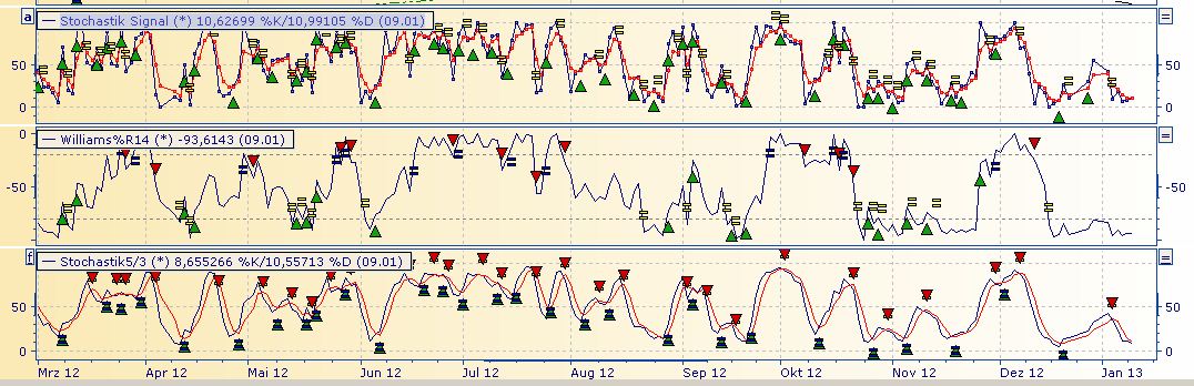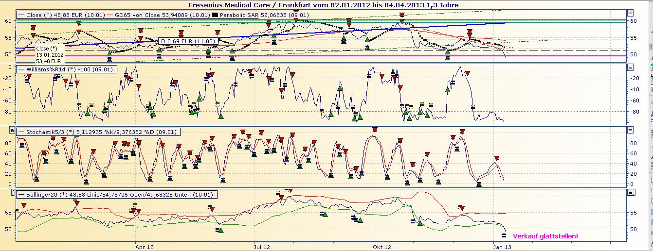 Irgendwann muss der Kurs ja mal einen Boden finden! Fakt ist, dass die erste eingezeichnete Unterstützung (rosa Linie) nicht gehalten hat; jetzt geht es in Richtung der nächsten Unterstützungslinie; dass diese erreicht wird, ist eher unwahrscheinlich, denn das Bollinger-Band signalisiert bereits "Verkauf glattstellen", und die kurzfristigen Indikatoren sind alle "platt" am Boden (nächster Chart); da ist zumindest eine "Technische Reaktion" wahrscheinlich!