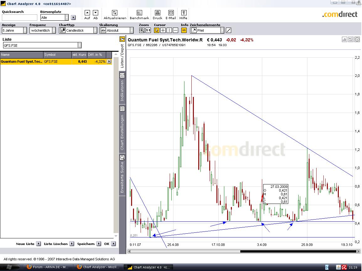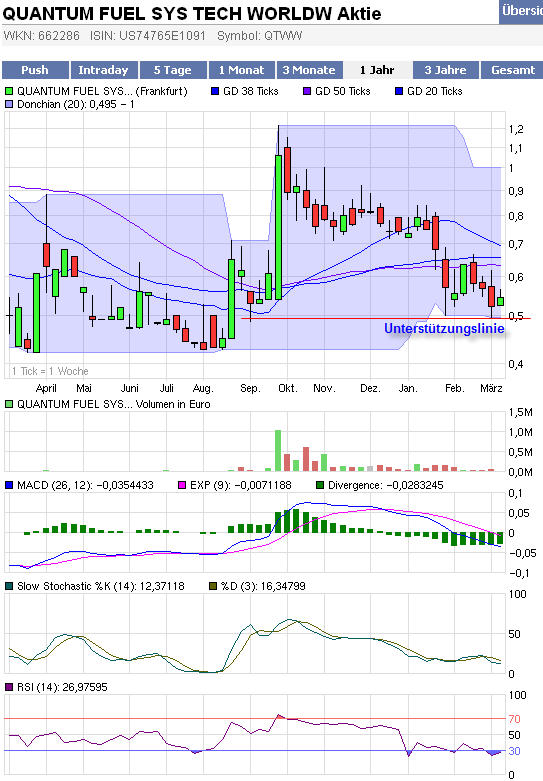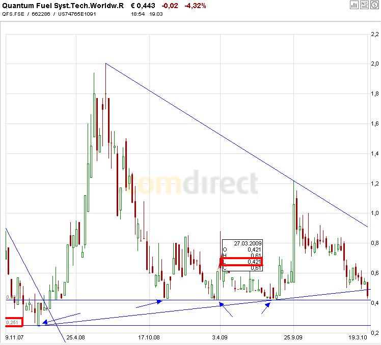 Mittel- bis kurzfristig (seit September 2009) ist Quantum zum dritten mal an der Unterstützung bei ca. 0,50 nach oben abgeprallt und aktuell überverkauft. Deshalb sollte es in den nächsten Tagen und Wochen wieder aufwärts gehen.
