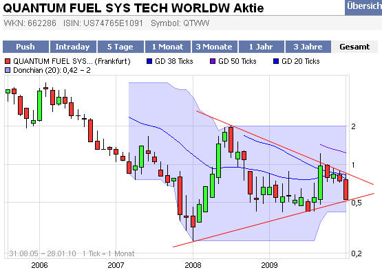 QFS ist relativ gut bei 0,70 € abgesichert. Dieser Bereich wurde mehrfach bestätigt. Ende Dezember 2009 gab es ein Kaufsignal gem. dem Donchian Kanal. Die Abwärsttrendlinie seit Oktober 2009 wurde zwar durchbrochen jedoch mit geringem Umsatz. Hier könnte die Konsolidierung weiterlaufen. Es könnte aber auch weiter über 0.80 € ansteigen. Der nächste Impuls sollte die Aktie bis auf 1,80 € führen. Dort sollte wieder eine Konsoliduerung eintreten.