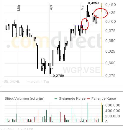 Ich bin bei WGP auf jedenfall auch langfristig, sogar sehr langfristig dabei. Ich hab bis jetzt zweimal gekauft und beide Male "intuitiv" einen ganz guten Zeitpunkt getroffen. Bei anderen Aktien ist das aber auch schon daneben gegangen. Deswegen will ich mich jetzt intensiver mit den Charts beschäftigen um, wenn ich mich entschieden habe, gute Einstiegszeitpunkte zu finden. Jetzt wird der ein oder andere sagen, dass das Wurscht ist wenn man bei einer Firma wie WGP long geht, aber das sehe ich anders. WGP zeigt doch ganz erhebliche Amplituden und da gab es in der Vergangenheit immer wieder Möglichkeiten gute NEWS nach einiger Zeit fast für umsonst zu bekommen. Wenn das diesmal wieder möglich ist, dann will ich davon profitieren und nicht jetzt einfach kaufen.
