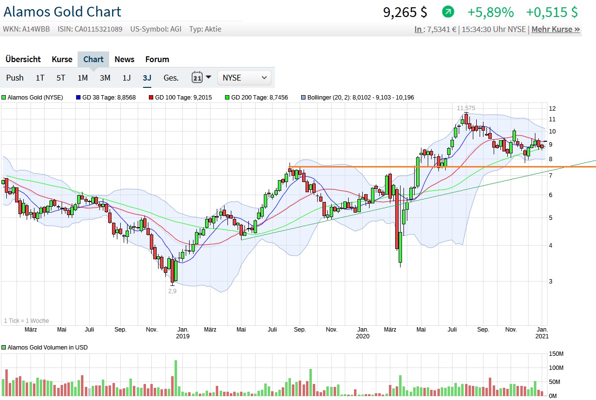 Alamos Gold: Planung für 2021 und Ausblick auf 2025 10.12.2020 | Minenportal.de Alamos Gold Inc. veröffentlichte gestern seine Planung für das Jahr 2021. Demnach rechnet das Unternehmen im kommenden Jahr mit einer Steigerung der Goldproduktion auf 470.000 bis 510.000 Unzen. Im Vergleich zur Prognose für das Jahr 2020 stellt dies ein Plus von 17% dar. Die gesamten Cashkosten dürften 2021 der Prognose zufolge mit 710 bis 760 USD je Unze 8% niedriger liegen als für das Jahr 2020 erwartet. Die All-in Sustaining Costs sieht das Unternehmen wie in diesem Jahr bei 1.025 bis 1.075 USD je Unze. Bis zum Jahr 2025 erwartet Alamos eine Goldproduktion von rund 600.000 oz pro Jahr. Unter Berücksichtigung des Projekts Lynn Lake bestünde sogar Potenzial für einen Anstieg auf 750.000 oz. Die All-in Sustaining Costs sollten zudem bis zum Jahr 2025 auf circa 800 USD je Unze sinken.