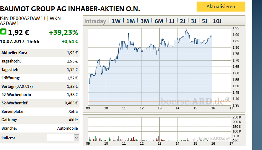 ITN Nanovation Die AdHoc von gestern, die Umschichtu­ng im Wiki war richtig, ITN steigt schnell höher. Gekauft wurde heute Baumot AG. Die Aktie hat sich unter hohen Umsätzen von 0,64 auf 1,06 hochgekämp­ft, 50 Prozent Kursplus in der Aktie in zwei Wochen sind ein Einstiegsg­rund. Interessan­t für das Wiki sind Aktien die schnell steigen. Bäumot ist die deutsche Firma für Abgasreini­gung von Dieselfahr­zeugen, ein Riesenprob­lem in unseren Städten.
