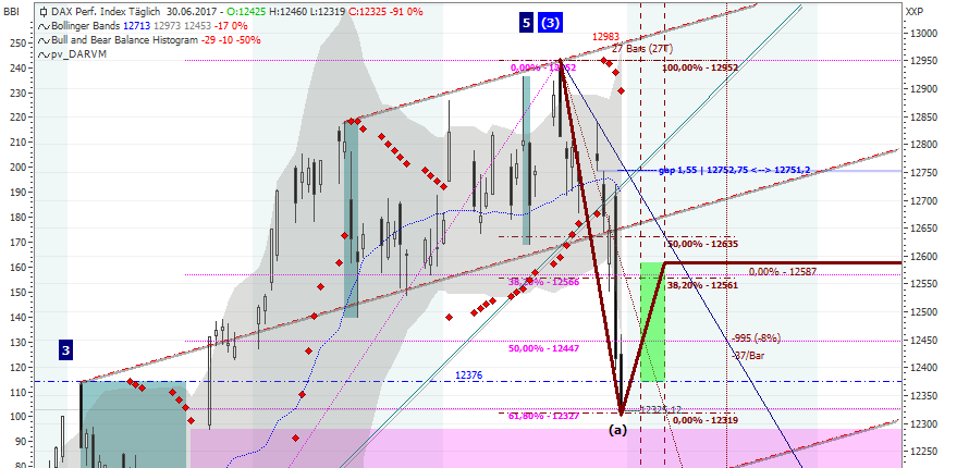 Wieweit könnte die DAXerholung gehen im Juli? Das Ziel kann nur lauten 12560, wenn ich die Strecke messe von 12955 bis 12315 ist das 38,2 Erholungsretrace bei 12560, dem Tief vom 28.06.2017 etwa. Deshalb am Freitag long positioniert mit Ziel 12560.