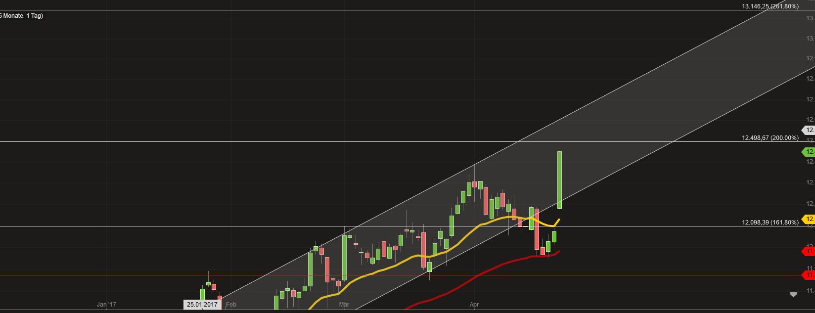 mal mit den 1000 Punkten zu Schreibfehlern. Obere Trendkanalbegrenzung 12608, 11608 ist der Schreibfehler. Aktuell als Ziel Mitte Mai 12608, dort Rücksetzer bis 12370 an das alte Jahreshoch einplanen.