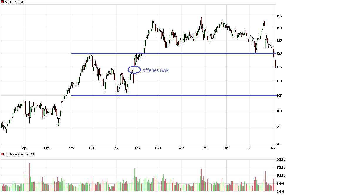 sieht man wie Apple eine wichtige horizontale Unterstützung im Bereich $118/120 Dollar gerissen hat. Zudem wurde auch die 200-Tagelinie unterschritten. Ich erwarte, dass nun das GAP bei ca $112,50 geschlossen wird. Hier werde ich einen weiteren Nachkauf tätigen. Sollte die Aktie dann immer noch nicht drehen, käme als nächstes die horizontale Unterstützung bei $105 ins Visier. Auch hier würde ich wieder als Käufer bereit stehen. Technisch orientierte Käufer meiden aktuell die Aktie und empfehlen eher Apple zu shorten. Mein Schwerpunkt liegt aber auf der fundamentalen Ebene. Fundamental sehe ich keien Veranlassung mein Invest in Apple zu beenden. Die panikartigen Verkäufe halte ich für übertrieben. Unter langfristigen Gesichtspunkten besteht nun die Chance für antizyklische Käufe.