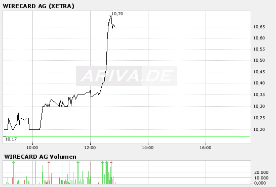 Die Aktie von Wirecard notiert aktuell mit einem Plus von 0,11 Prozent bei 10,29 Euro. (13.07.2007/ac/n/t)