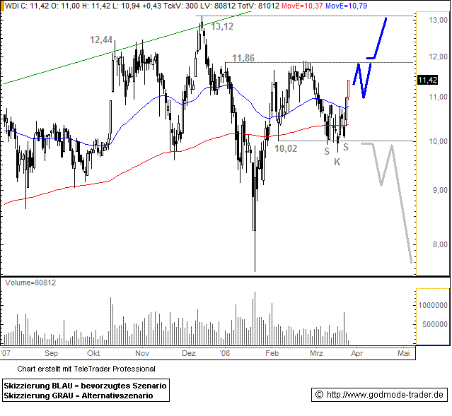 Kurzfristig wurde im gestrigen Handel eine kleine inverse Schulter-Kopf-Schulter Formation am unteren Ende dieser Seitwärtsbewegung mit Überschreiten von 10,83 Euro vollendet. Das Ziel dieser Formation liegt nun bei ca. 11,90 Euro und damit im Bereich des Widerstandes bei 11,86 Euro.