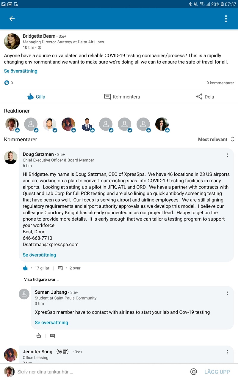 Obwohl noch nichts endgültiges festgelegt wurde, befindet sich XpresSpa derzeit in Gesprächen mit drei großen Flughäfen, dem JFK International Airport, dem Hartsfield-Jackson Atlanta International Airport und dem Chicago O'Hare International Airport, um das COVID-19-Screening und -Test für Mitarbeiter, Auftragnehmer und Arbeitnehmer von Fluggesellschaften zu testen , Konzessionäre und ihre Mitarbeiter, TSA-Agenten und US-Zoll- und Grenzschutzagenten. Das Unternehmen ist auch dabei, einen medizinischen Direktor zu rekrutieren, der mit Gesundheitsbeamten zusammenarbeitet, um sichere und konforme Protokolle zu entwerfen und Mitarbeiter zu schulen.
