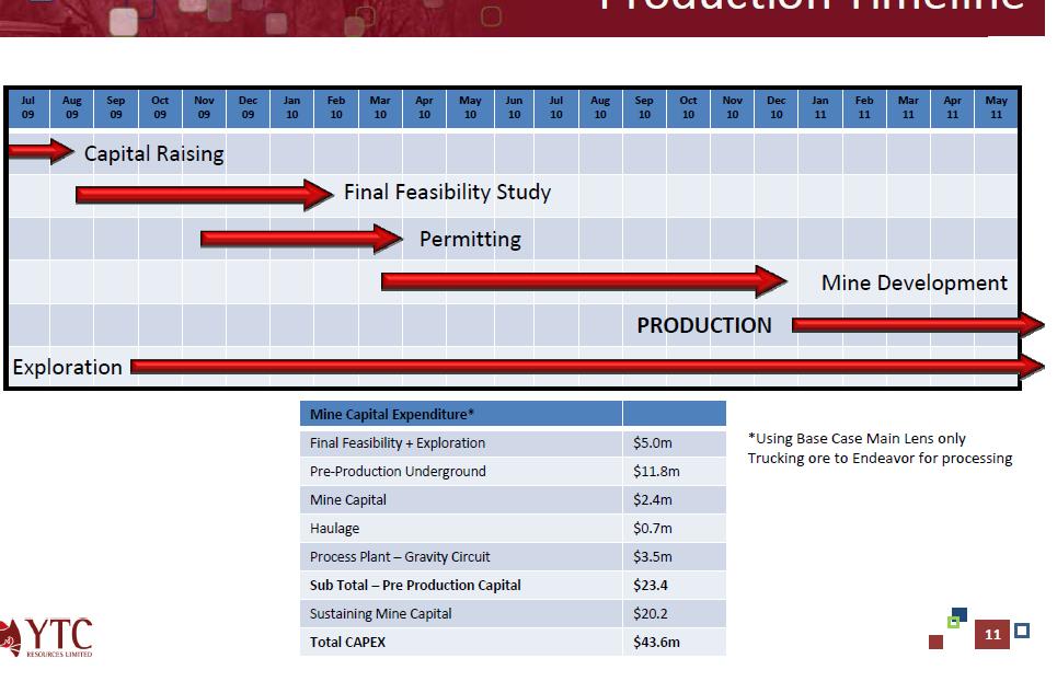 Now considering the EV/Resource ounce (AuEq) of less than $90/oz, and the EV/Reserve Oz of less than (AuEq) $130/oz - and with production from Hera potentially starting late 2012 and Nymagee to follow in 2013 - YTC will soon transition to a self funded explorer.
