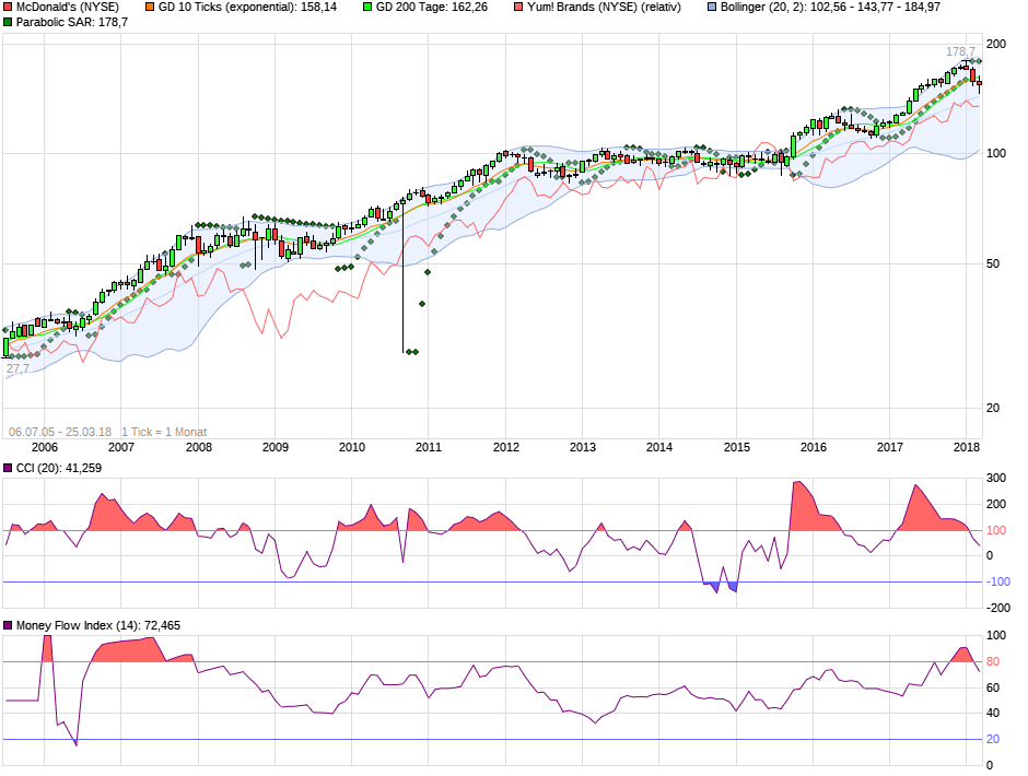„.....Yum Brands ist mit über 45.000 Läden eine der weltweit größten Restaurantketten in der Systemgastronomie. Unter dem Label des 1997 gegründeten Konzerns sind Betriebe wie Kentucky Fried Chicken, Pizza Hut oder auch Taco Bell vereint. Der Umsatz lag im vierten Quartal des Fiskaljahres 2017 bei 1,26 Mrd. US-Dollar (Vorjahr: 0,83 Mrd. US-Dollar).“