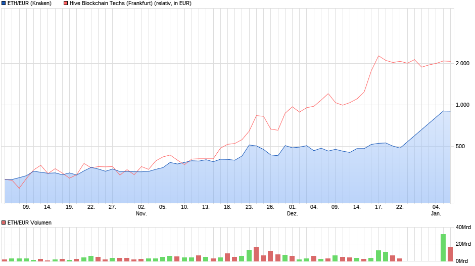 Ethereum hat Bitcoin in den letzten 12 Monaten weit übertroffen. BTC ist um 815% und ETH um 1.336% gestiegen.