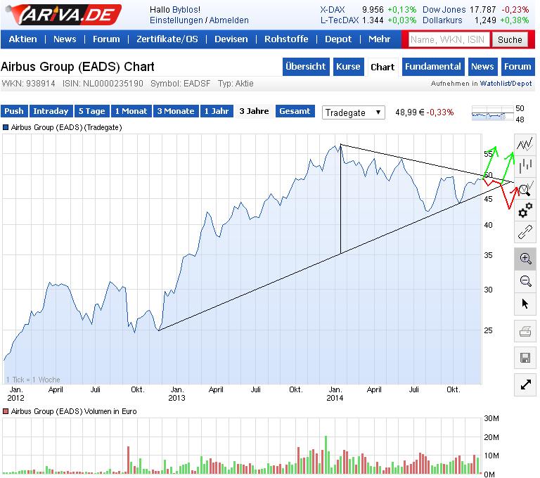 Ich warte seit langem auf den Ausbruch. Ich denke er wird nicht kommen und habe schon bei 47,50 ein SL sollte er da runter gehen bin ich draußen und wünsche euch noch viel spaß mit Airbus :)