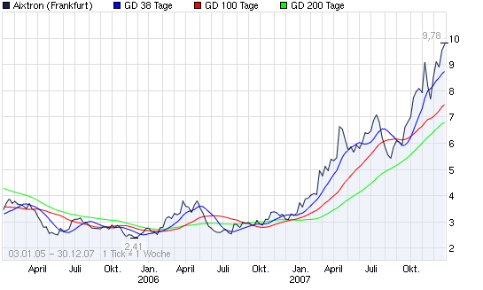 Im hier unten anhangend graphisch documentierten AIXTRON-Beispiel eines typischen Normalo- oder WARM-Stock's durfte der nach dem Golden Cross des FEBRUAR's 2006 im SEPTEMBER 2006 geschaute FALLING-SMA(100)-Down-under-200 einen recht STEILEN Winkel einnehmen, OHNE sich von seinem Dasein als FEHL-Signal zu einem ECHT-Signal hin zu emancipieren. - Bei HOT-Stocks liegt die Erlaubtheit dieses Winkels um einiges FLACHER...