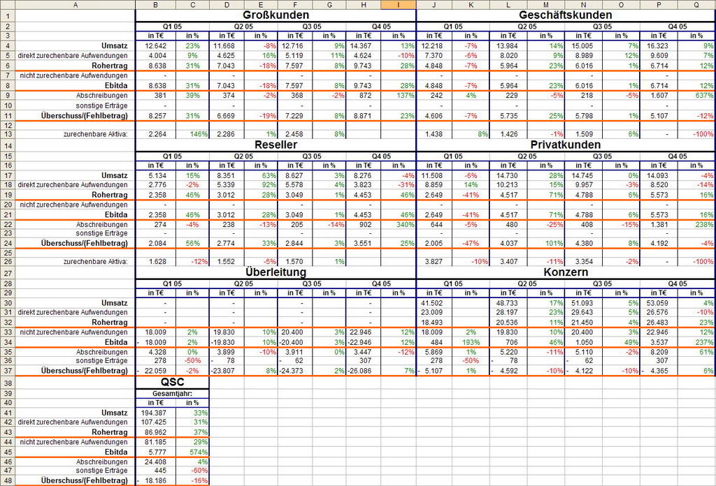 Heute hat QSC den Geschäftsbericht 05 veröffentlicht und ich habe mir einmal die Mühe gemacht meine Übersicht über die Quartalsergebnisse auf den neuesten Stand zu bringen.