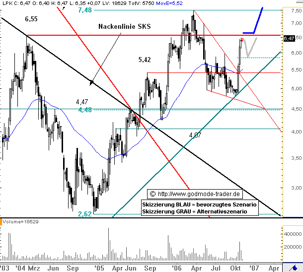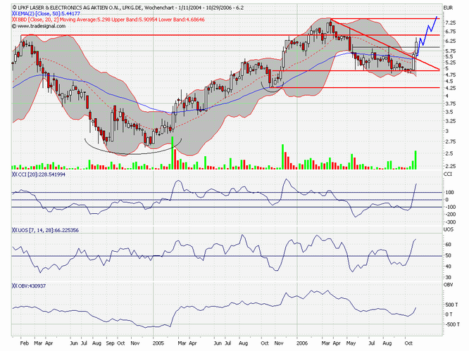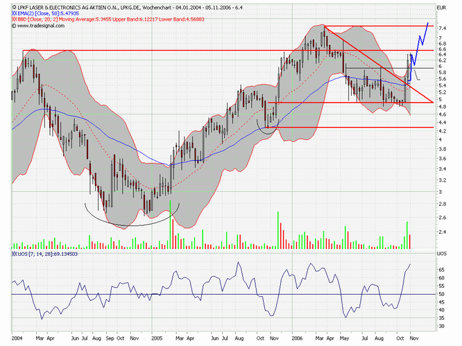 Kurz-Kommentierung: Die LPKF LASER Aktie korrigierte nach dem Hoch aus dem Hoch aus dem März 2006 bei 7,48 Euro in einem bullischen Keil. Aus diesem Keil brach die Aktie Mitte Oktober nach oben aus. Zugleich durchbrach sie auch den Widerstand bei 5,42 Euro. Seit letzter Woche schiebt die Aktie eine kleine Konsolidierung unterhalb des Widerstandes bei 6,55 Euro ein. Im Rahmen dieser Konsolidierung wäre ein Rücksetzer bis ca. 5,85, also an das 38,2% Retracement der letzten steilen Aufwärtsbewegung unproblematisch. Mittelfristig ist ein Ausbruch über 6,55 Euro und ein Anstieg bis zunächst 7,48-8,00 Euro zu erwarten. Langfristig gilt unverändert ein Ziel bei ca. 30,00 Euro, welches sich aus einer großen SKS Bodenformation ergibt, welche die Aktie im Juli 2005 mit dem Ausbruch über die Nackenlinie vollendet hatte.