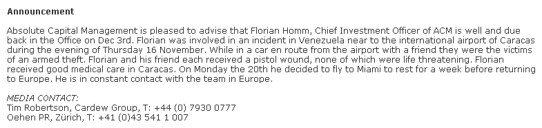 For ACMH, the award reflects a period of significant growth and development. In 2006 the Company has seen a growth in Assets Under Management to over USD 1bn, listing on the AIM in London and successfully providing investors with absolute returns for all six funds currently under management. In addition to the company's award winning fund range, ACMH will launch two new funds on the 1st July 2006; the Absolute Activist Value Fund (AAV) and the Absolute India Fund (AIF).