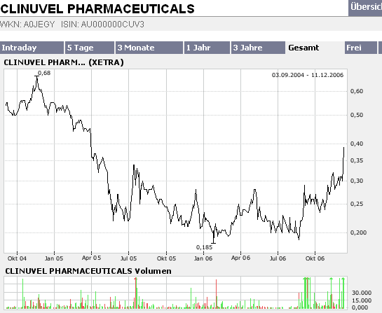 Florian Homm: Viertes Segment ist eine positive Nebenwirkung der Substanz. Man wird braun ohne in die Sonne gehen zu müssen. Dieser Markt ist wahnsinnig groß. Allergen, die Botox produzieren, ist derzeit mit 14 Milliarden Euro bewertet. Warum sollten Leute, die sich ihre Falten wegspritzen lassen, sich nicht sagen: Klasse, ich kann jetzt meine Haut schützen und gut aussehen ohne mir die Haut zu verbrennen. Wenn alle vier Kernsegmente aufgehen, haben wir ein Bewertungspotenzial von 1,5 bis 3 Milliarden Euro. Auf der Risikoseite ist EPP, unter anderem als die Hannelore Kohl Krankheit bekannt, sehr viel versprechend. Das sichert die aktuelle Bewertung nach unten ab. Aktuell ist Clinuvel mit 70 Millionen Euro kapitalisiert, davon circa die Hälfte in Bargeld unterfüttert und somit komplett durchfinanziert. Eine ernsthafte Konkurrenz ist auf breiter Sicht nicht erkennbar. Für 2007 rechne ich zudem mit einer industriellen Partnerschaft, in einem der vier Kernsegmente. Allein dies wäre auch gut für eine Kursverdoppelung. Wir haben somit zahlreiche Auslöser, die zur Neubewertung führen können.