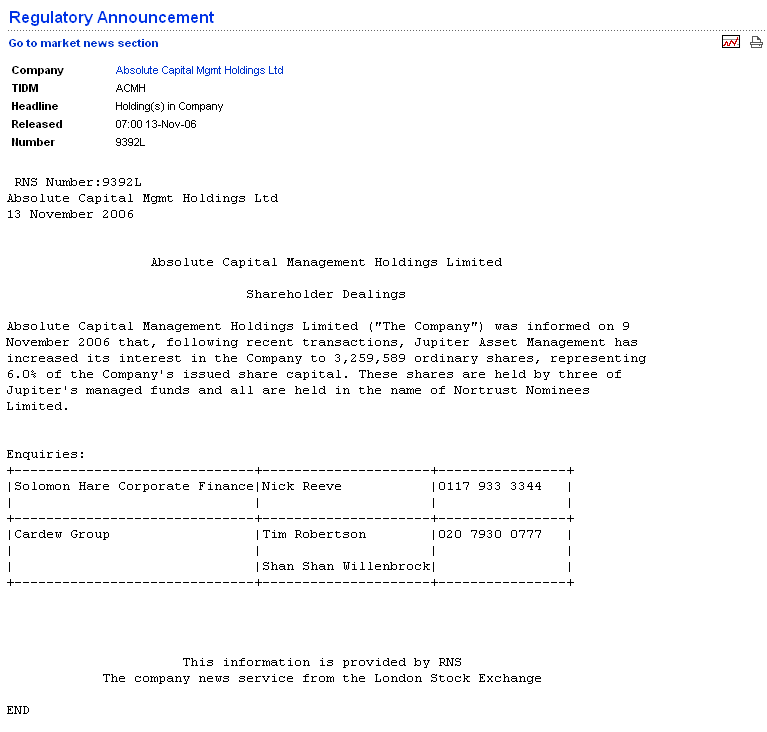 Published: 12:50 10.07.2006 GMT+2 /HUGIN /Source: Absolute Capital Management /GER: ACM /ISIN: KYG006011079