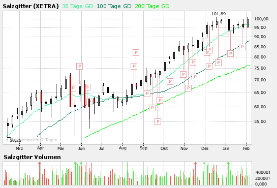 Salzgitter ist dabei die kleine (denn es gab hier schon größere) Konsolidierung im Januar zu beenden. Wenn der Schlusskurs über 100 € liegt, ist das unten genannte Kursziel nur noch einen Katzensprung für die Aktie.