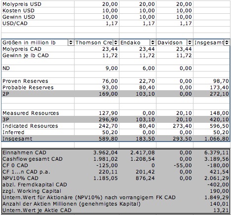 Wie dem Datenkorsett entnommen werden kann, geht obige NPV-Berechnung von einem Gewinn vor Steuern von 10 USD je lb aus und kommt zu einem Wert von 17 CAD je Aktie. Das bedeutet, dass beim jetzigen Kurs nur ein Gewinn von etwa 5 USD eingepreist ist. Im Grunde genommen also eine 50%ige Unterbewertung vorliegt.
